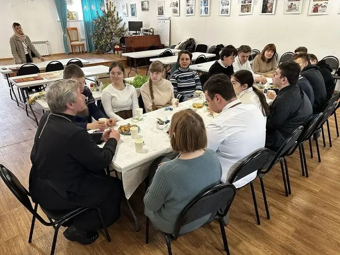 В актовом зале духовно-просветительского центра «Источник» было организовано чаепитие, во время которого состоялось общение с настоятелем храма протоиереем Сергием Красниковым.